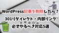 ブログ運用 WordPress記事を削除したら?リダイレクト・リンク切れなど忘れがちな対応5選 ある程度の期間Wordpressでブログ記事を書いていると、「もうこの内容はいらないかも…」「アクセスも少ないし、削除しようかな」と思うことがありますよね。しかし、WordPressで記事を削除したことに満足して、そのまま何もしないでいるの... 2025.07.07 ブログ運用